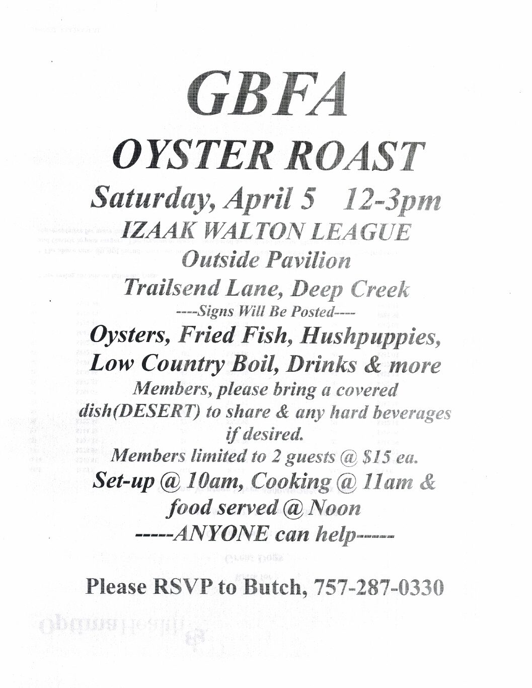 GBFA AWARDS BANQUET Free to members RSVP to Butch Pierce $15 for guest Bring desert optional 6:00 PM Social and viewing of the Extravaganza Raffle Table.. ( Bring plenty of ones, you will need them) 7:00 PM Dinner Also, Set up will begin at (9:00 AM Saturday..All help will be appreciated .. The more we […]